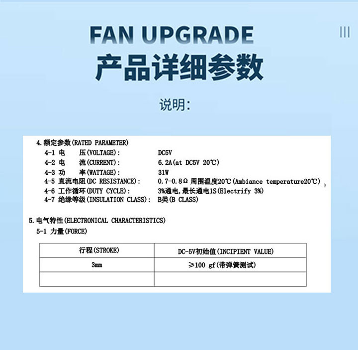 | 电压: | DC5V | 行程: | 电阻: | 0.7~0.8 | 功率: | 31W | |