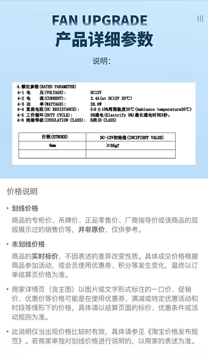 | 电压: | DC12V | 行程: | 6MM | 电阻: | 5欧 | 功率: | 28.8W |